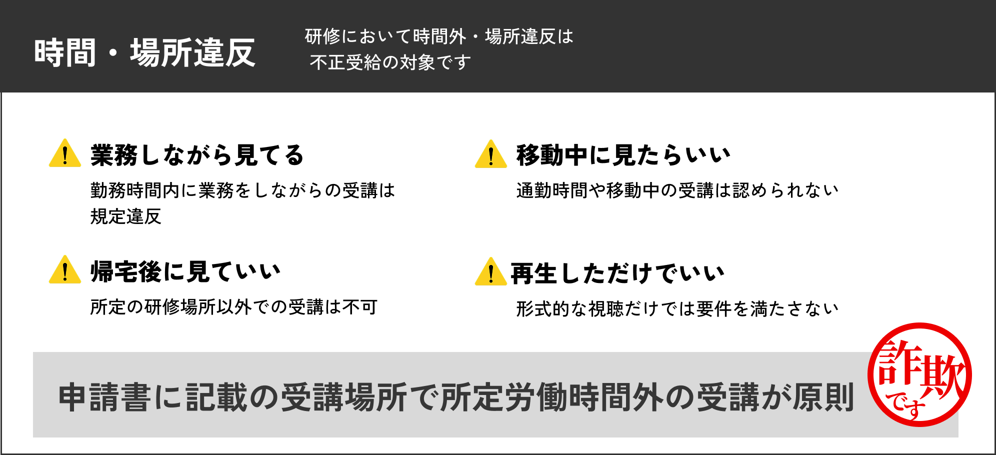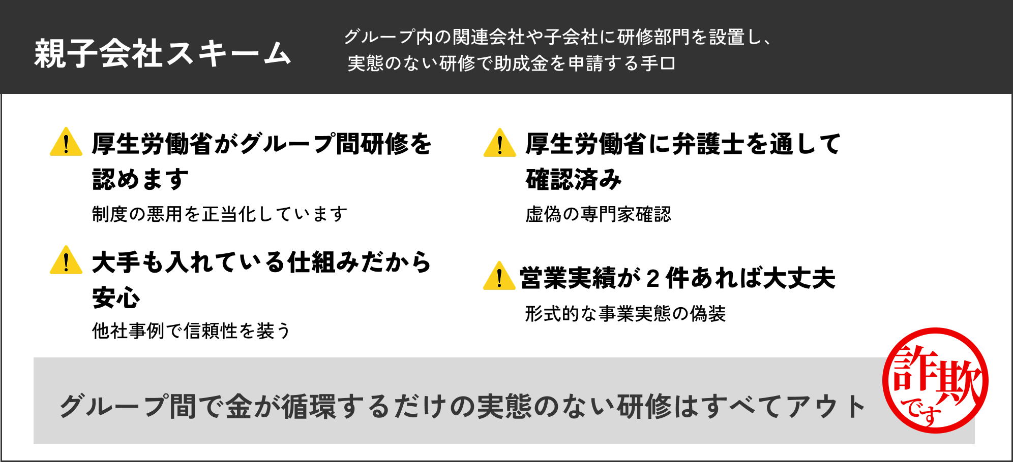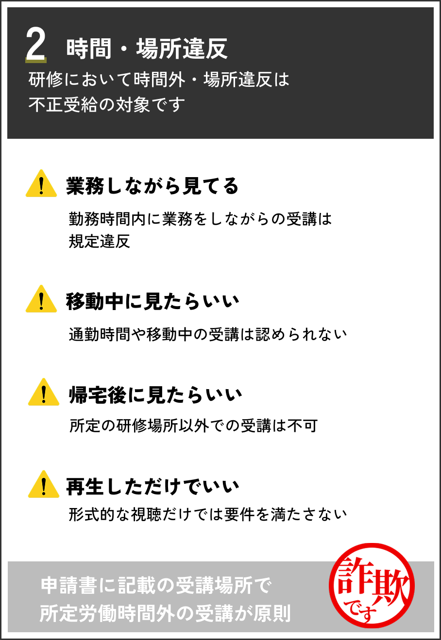 実態のない研修や、実際には研修を行わず、帳簿や領収書だけを整えて申請するやり方。