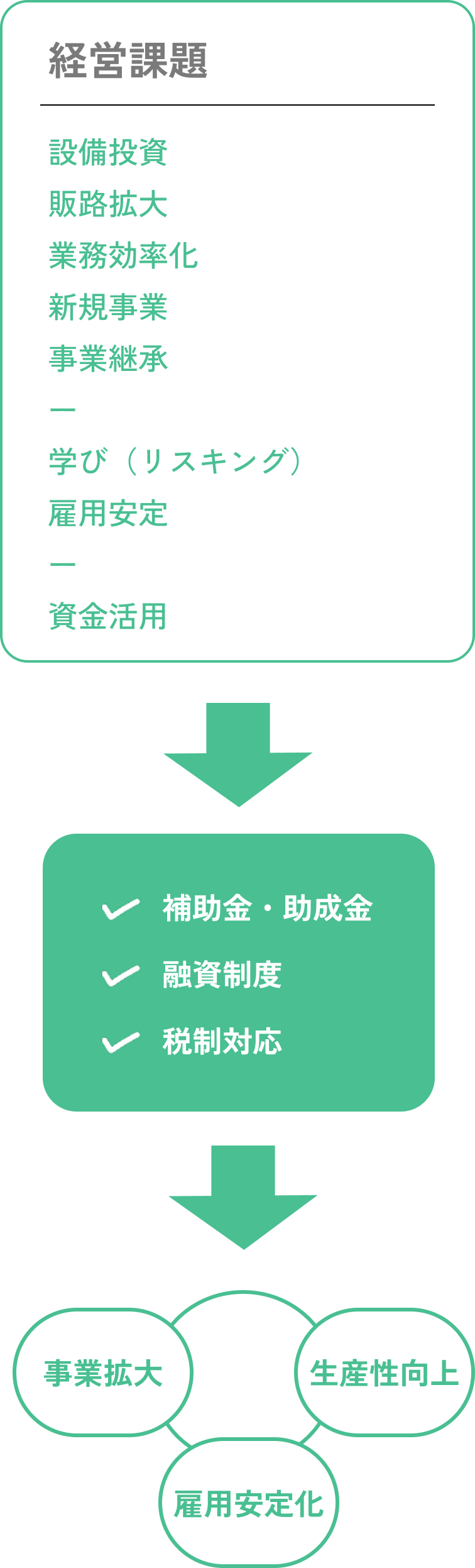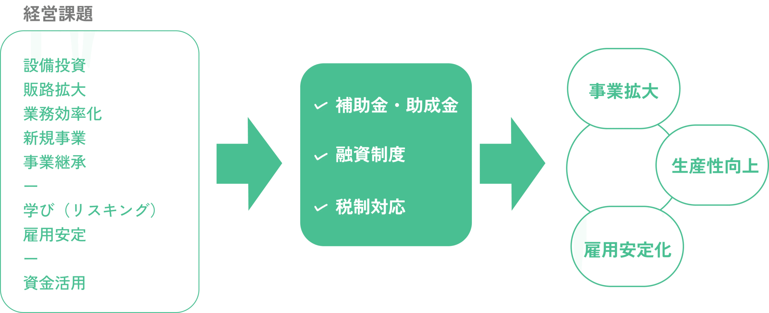 活用できる制度は、業種・目的・企業規模・時期によって異なります。